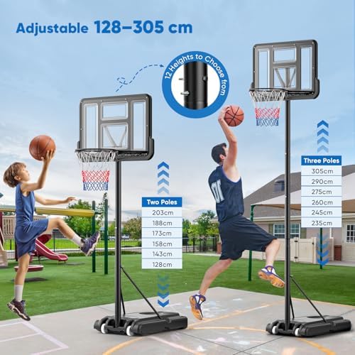 Outdoor Basketball Hoop,Pportable Basketball Hoop,Adjustable Basket Height from 128 to 305 cm,Basketball Stand with 110x75cm Backboard,Comes with Two Interchangeable Basketball Nets