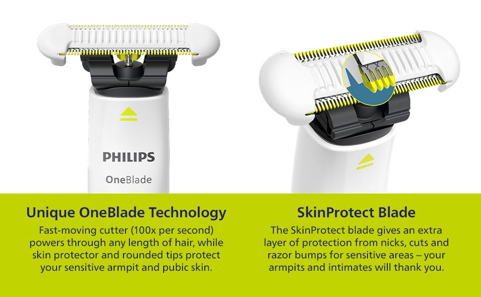 - Unique OneBlade Technology: fast-moving cutter (100x per second) powers through any length of hair, while skin protector and rounded tips protect your sensitive armpit and pubic skin