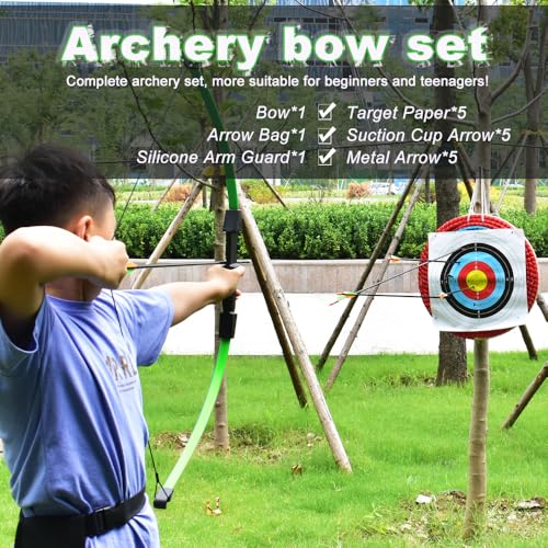 - Archery set: Suitable for teenagers and children, this bow and arrow set comes with 5 metal and 5 suction cup arrows, 5 sheets of target paper, 1 arrow quiver, 1 armguard, fully equipped and ready to start using immediately.