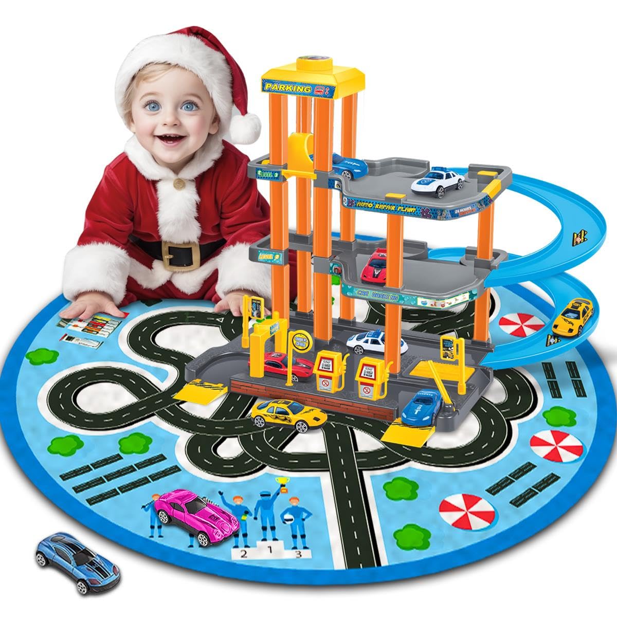 - Interactive Multi-Level Parking Garage: This playset features a realistic multi-level garage with spiral ramps allowing kids to park vehicles. This palyset provides a hands-on experience, while playing & learning.