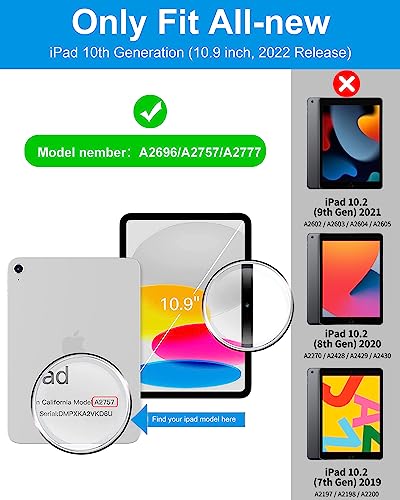 - [Compatibility] Protective case for iPad 10th Generation 10.9-Inch 2022; Fit iPad Models: A2696 A2757 A2777. It is Not compatible with any other devices. Please check back bottom of your iPad to find the model number.