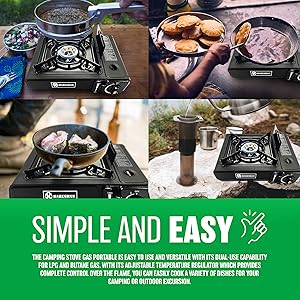 - ✔️ GAS STOVE – Our portable camp gas stove is lightweight, and safe that allows you to enjoy delicious hot food and drinks anytime and anywhere. Perfect for outdoor cooking, camping, travel, fishing, and parties, this versatile mobile kitchen is a must-have for anyone looking to elevate their outdoor dining experience. The camping stove gas portable is easy to use and versatile with its dual-use capability for LPG and Butane Gas. With Its adjustable temperature regulator which provides complete control over the flame, you can easily cook a variety of dishes for your camping or outdoor excursion.