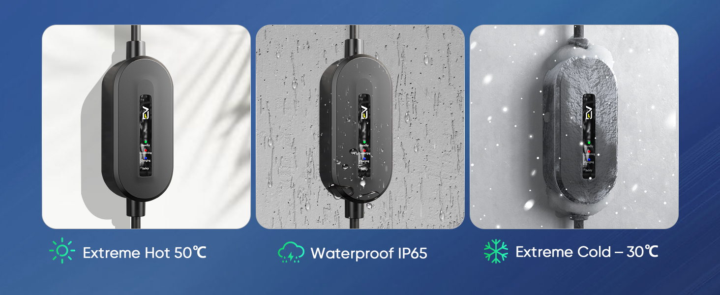 - 【MULTIPLT PROTECTION】 Our 3 pin EV charger is UKCA, CE, TUV and UL certified and feature multiple protections against overcurrent, overheating, leakage, overvoltage, undervoltage, and overvoltage. IP67 and IP65 waterproof ensure the EV charger will work safely in wet underground garages. It can withstand operating temperatures from -30°C to 50°C, whether a cold winter or summer the ev charger will still work. (IP67 – when type 2 plug is plugged in, IP65 – control box)