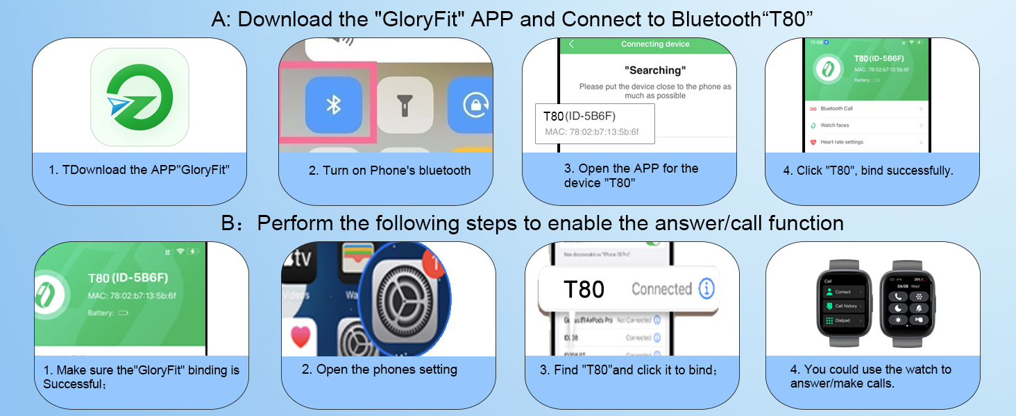 - 1.95 inch Touch Screen and DIY Dial: T80 Smart watch adopt 1.95”TFT HD color display screen with a 320 x 386 resolution, offers excellent image quality, high sensitivity touch. When you connect the smartwatch with the "GloryFit" APP, there will be more than 200 online dials for you to choose from, and you can also set your favorite photo as the dial to make it more personalized. (Press and hold the screen for 2 seconds and swipe left or right to switch between the system dials)