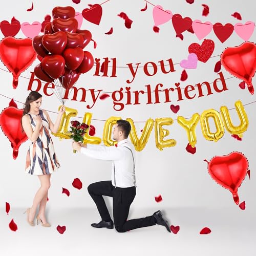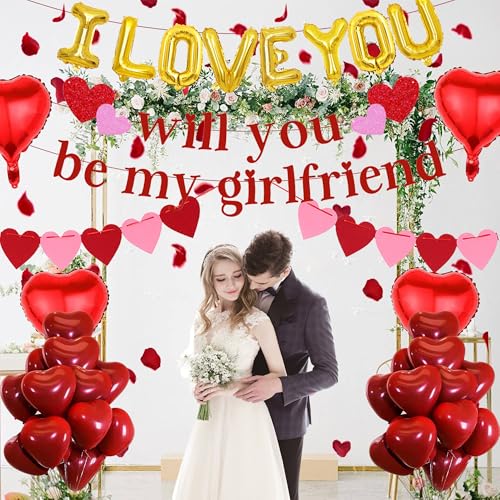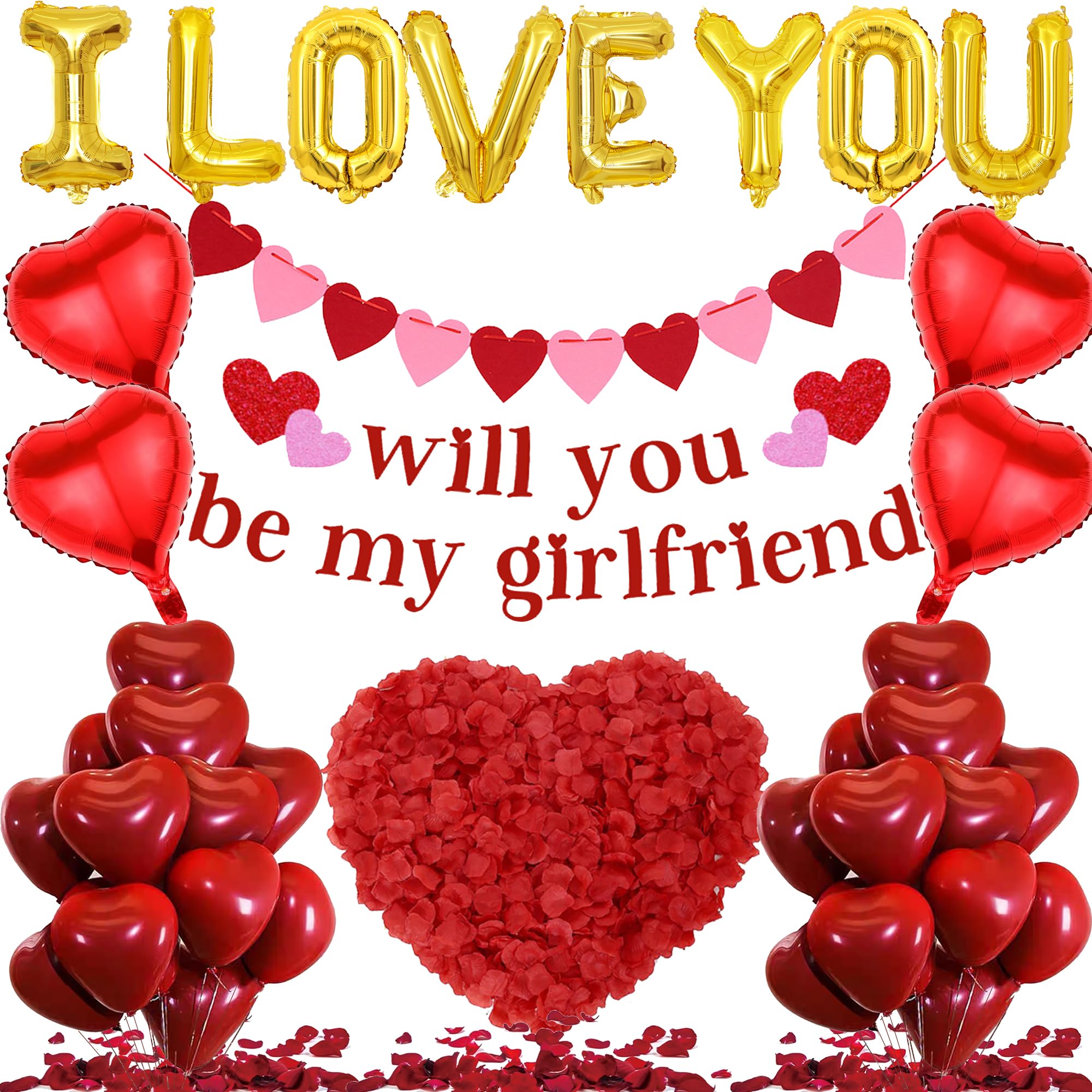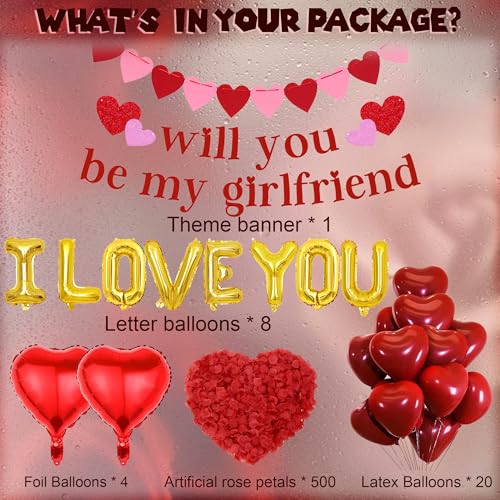 - Package Includes:8 Letter Gold Foil Balloons(I Love You),1 Will You Be My Girlfriend Banner,500 Artificial Rose Petals,4 Red Heart Foil Balloons 20 Latex Balloon,1 Heart Pull Flag,Decoration Kit Is Beautiful, Add A Different Color To Your Romantic Moment