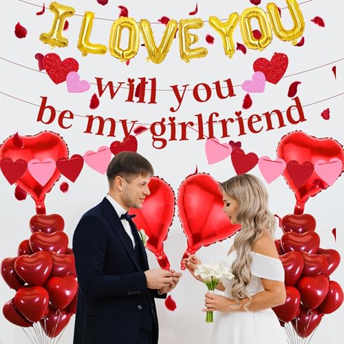 Will You Be My Girlfriend Includes I Love You Letter Balloons, Red Heart Foil Balloons, And Artificial Rose Petals.Combined With These Elements, Balloons Set Can Not Only Deliver Affectionate Messages In A Stylish Way, But Also Add Romance To Your Venue