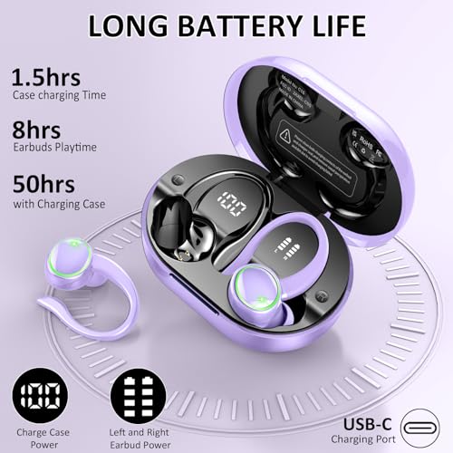 - 50 Hrs Playtime and Dual LED Display: Headphones with fast charging Type-C interface, the earhook headphones be fully charged for only need 1.5 hours. The wireless earbuds can last 8 hours music time from a single charge and provides extra 40 hours playtime with charging case.Wireless earphones use the unique Dual LED display technology to accurately display the remaining power of earbuds and charging case so you can master the time to charge it.