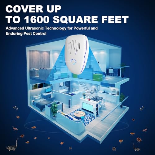 - 【Wide Coverage Ultrasonic Pest Repeller】:Our ultrasonic pest repeller provides effective coverage of up to 1600 square feet, ensuring comprehensive protection for homes, offices, warehouses, and more. Equipped with advanced 3D surround dual speakers, it delivers 360° ultrasonic waves, driving pests away from every corner. For optimal results, use one device per room, as ultrasonic waves cannot pass through walls or solid objects. Ideal for a variety of indoor spaces, including homes, garages, restaurants, and hotels