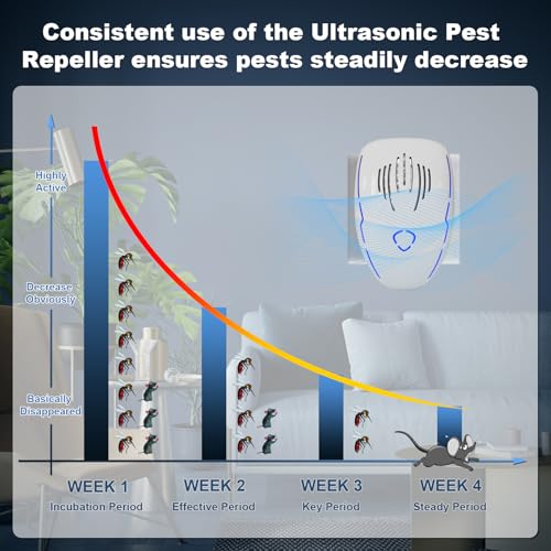- 【2025 Upgraded Ultrasonic Pest Repeller】:Featuring dual ultrasonic and electromagnetic technology, this device effectively repels mice, mosquitoes, spiders, and more by disrupting their nervous systems with dynamic frequencies. Safe for pets and humans, it offers chemical-free protection.Designed for continuous use, this mice repellent typically shows results in 1-2 weeks