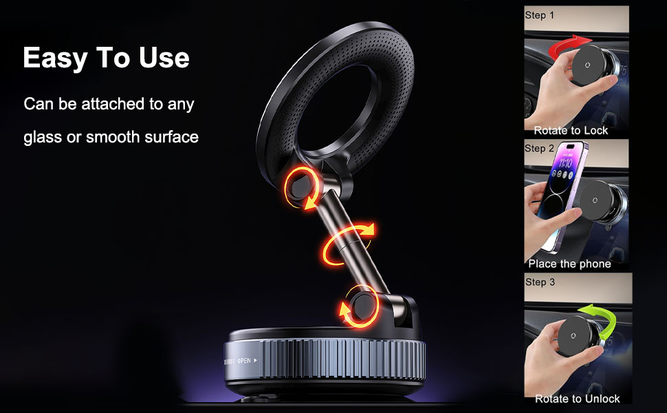 - 【360-degree rotation】The magnetic automotive suction cup holder has a 360-degree rotation function to seamlessly switch between longitudinal and lateral positioning. You can adjust according to your driving habits and actual needs, ensuring that your mobile phone is fixed in the perfect position to provide you with the best driving experience