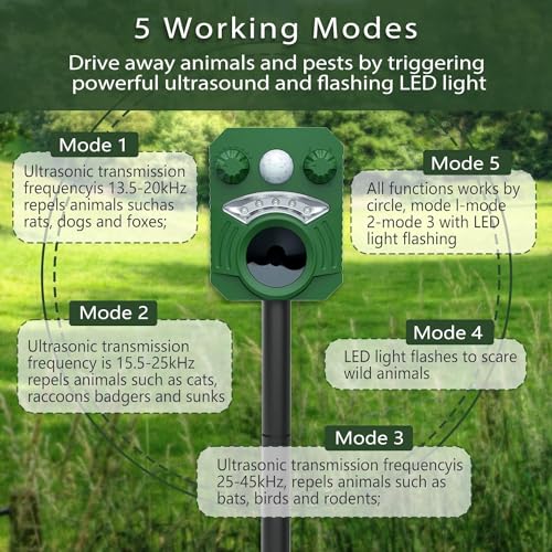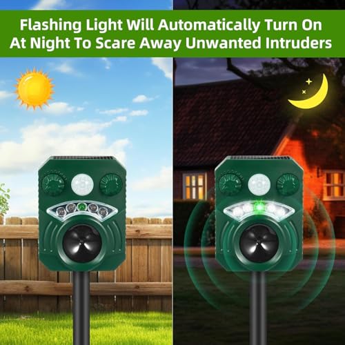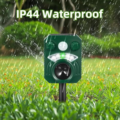 - 【Harmless and Humane】: Ultrasonic solar animal repellent is designed to repel small animals in a chemical-free and humane way, rather than injuring and killing, perfect for those who are bothered by animals but don't want to cause any harm. The effective working distance is 8 meters and the effective range is 110°.