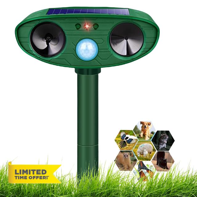- ✔ Solar Powered and Waterproof – No wiring and no batteries to replace, features a solar panel on the top of the device that harnesses the sun's energy and charges the batteries. The ultrasonic animal repellent with IP44 waterproof design allows operation on rainy days, It can be left out in any weather.