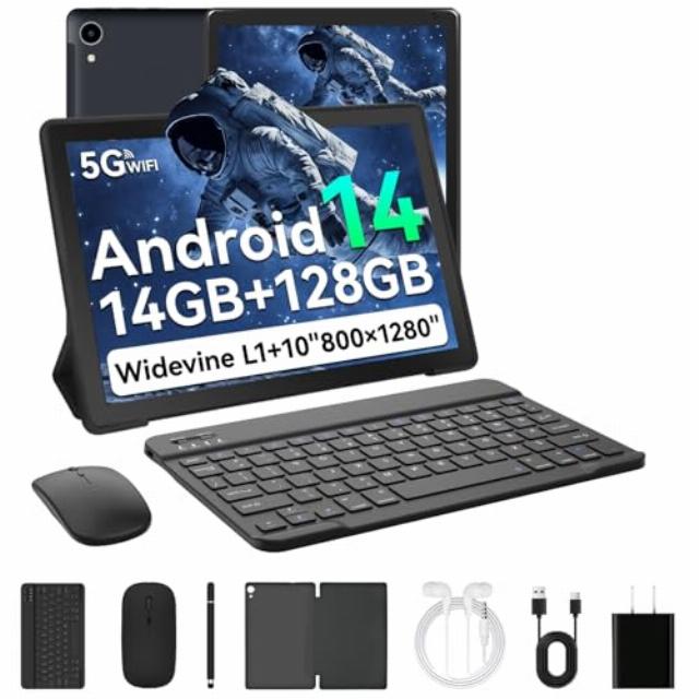 Whitedeer 10 inch Tablet Android 14, 14(4+10) GB+128GB, Octa-Core Tablet, 800 * 1280 HD丨WiFi 6丨BT 5.0丨5000mAh丨5MP+8MP, Widevine L1, Tablet with Keyboard丨Mouse丨Stylus丨Tablet Case丨 Headphone(Black)