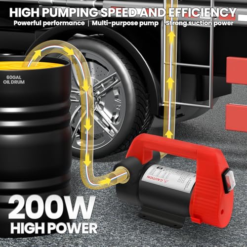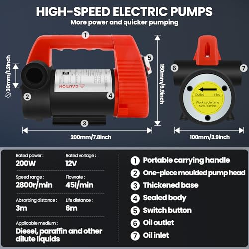 - 【Powerful Function】- Diesel Transfer Pump Equipped with a 200W oil pump, it can extract 45L/min, gallons of oil at a time with strong suction power.
