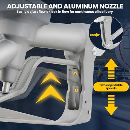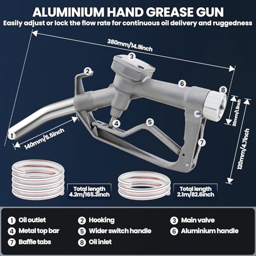 - 【Oil Gun Size】- The oil Gun measures 14.9 inches x 4.7 inches and is equipped with Aluminium manual nozzle, flow rate can be adjusted in two speeds, easy to control the pumping speed.