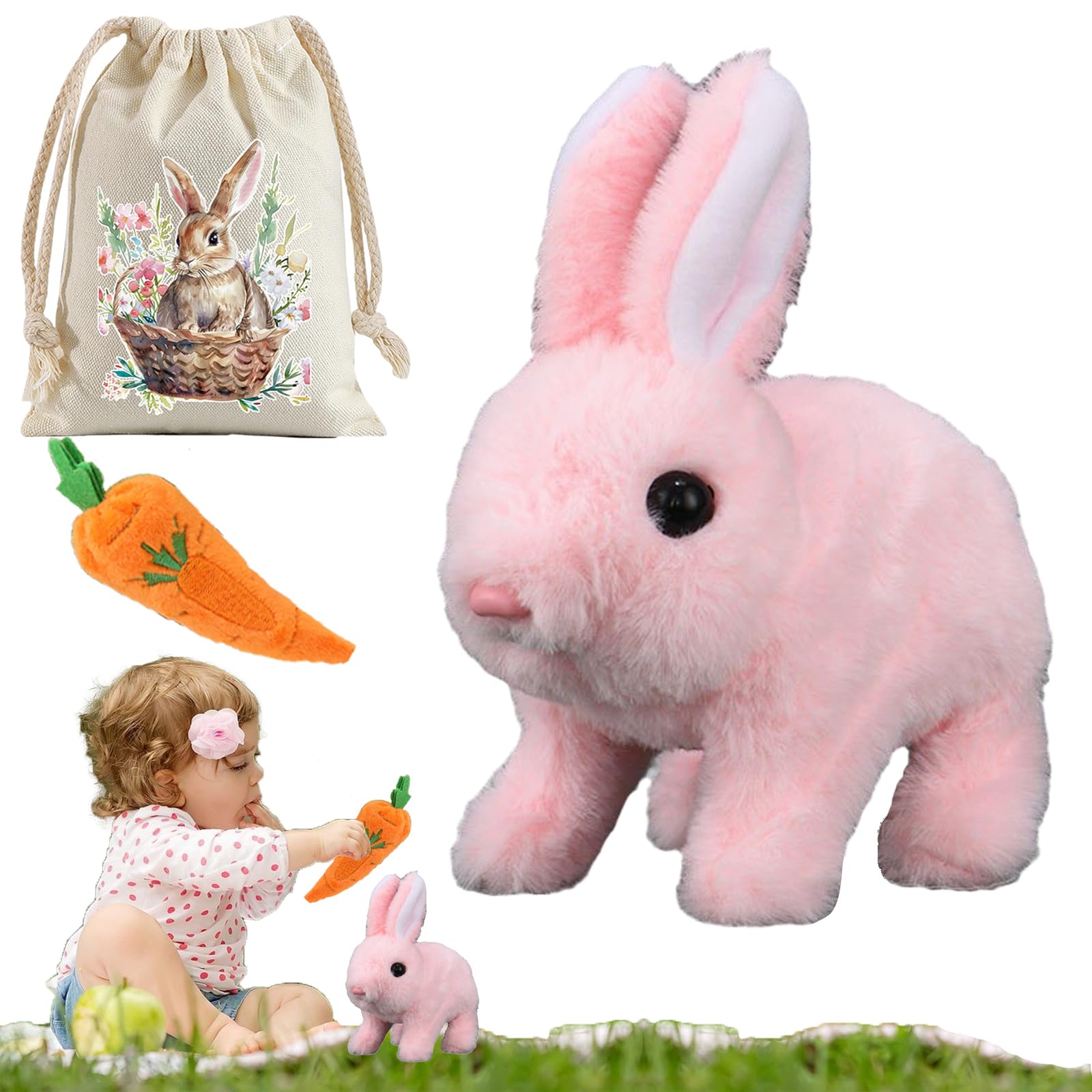 3PCS Plush Realistic Bunny Toy Set, Interactive Rabbit Toy Carrot Gift Bag Soft Hopping Bunny Doll Jumping, Twitching, Shaking Ears, Sound, Kids Christmas Birthday Easter Stuffed Bunny Gift(Pink)