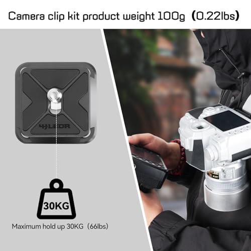 - 【HIGH QUALITY AND POWERFUL】The main body of the camera belt clip kit is made of high-strength aluminum alloy, which is sturdy and durable, and can bear 66.14 pounds/30 in the vertical direction. kg, very sturdy but lightweight; rubber pad design on the top plate to prevent scratches on the bottom of the camera; non-slip rubber material inside to comfortably and firmly fix your strap, eliminating the worry of the clip moving