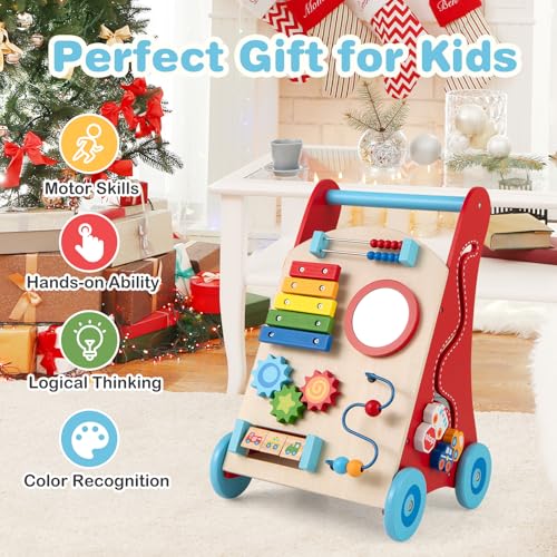COSTWAY Wooden Baby Walker, Infant Push Along Activity Walkers with Interactive Activities, Toddler First Steps Early Development Toy (Red+Blue)