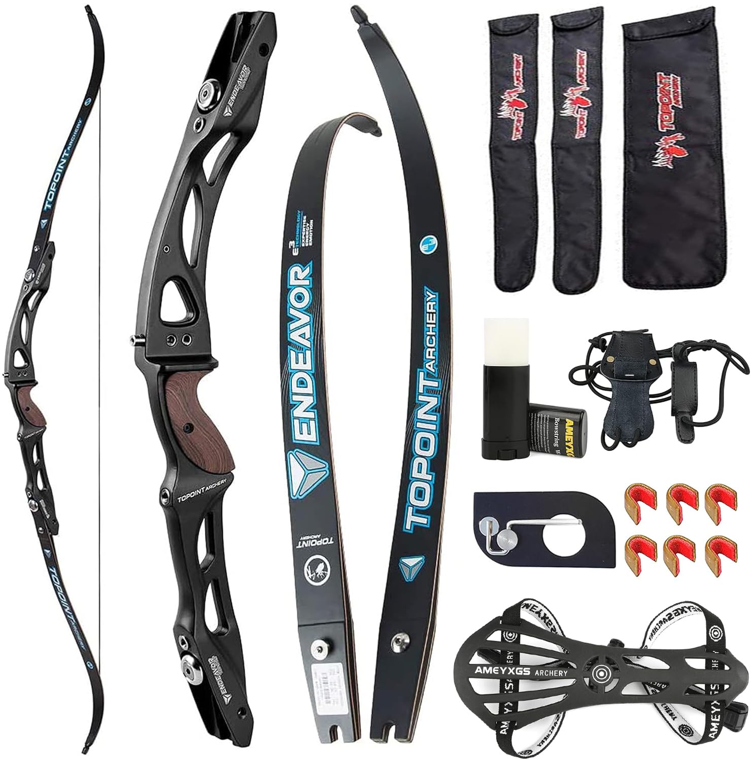 - Bow Set includes:1 x ilf Recurve Bow ;1 pair of bow limb bag;1 x bow riser bag; 1 x arm guard;1 x bowstring wax;1 x arrow rest;1x Stringer Tool;6x Copper Buckle.