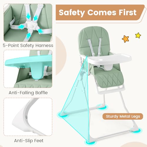 Maxmass Foldable Baby Highchair, Infant Dining Chair with 3-Position Adjustable Tray & Footrest, Removable Seat Cushion, 5-Point Safety Harness, Portable High Chair for Babies and Toddlers (Green)