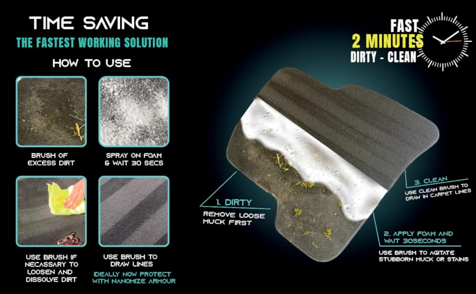- CLEAN : Innovative Cleaning Power: Say goodbye to dirt and grime with our fast-acting foaming solution. No scrubbing or soaking required—just pump, apply, and wipe to achieve spotless results on car interiors, sneakers and fabric surfaces. Fast-Acting Formula: Cleans and revitalizes in minutes, saving you time and effort.