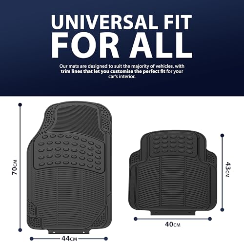 - UNIVERSAL TRIM-TO-FIT DESIGN – These mats are designed to fit most vehicles with pre-marked trim lines, allowing you to cut along the guides for a tailored fit. Say goodbye to awkward edges and uneven coverage.