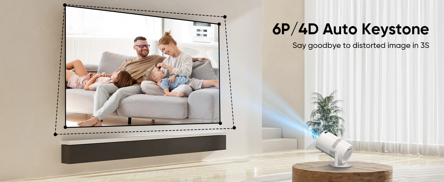 - 【3S Keystone Correction & 210° Adjustable Stand】No more distorted images! This smart projector has a fully automatic keystone correction that is calibrated based on four points to get a perfectly aligned image without limitation in seconds. The projector with built-in stand can be adjusted by 210 degrees. So you can easily project onto the wall or ceiling and enjoy a nice movie night from any corner of your home