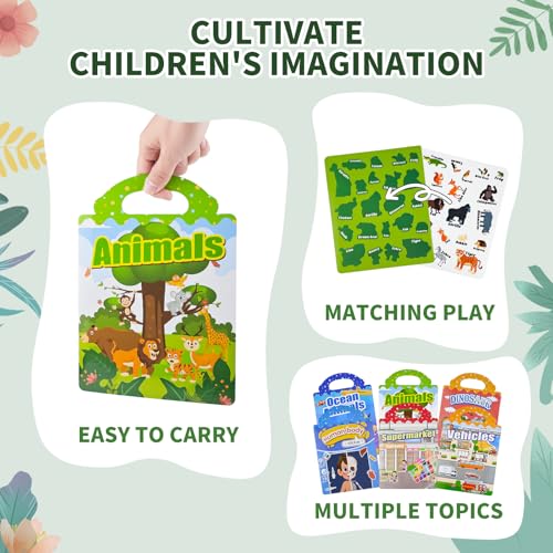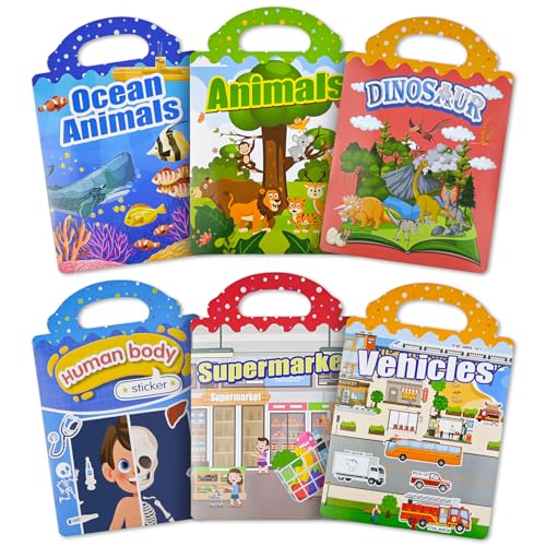 6Pack Reusable Sticker Books for Toddlers,3D Puffy Stickr Books for Kids 2+ Year Old, Vehicles, Animals, Dinosaur,Ocean,Body,Supermarket Jelly Sticke Game Educational Sensory Learning Toy
