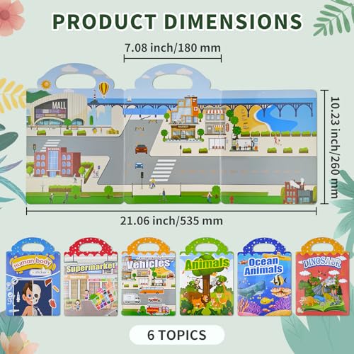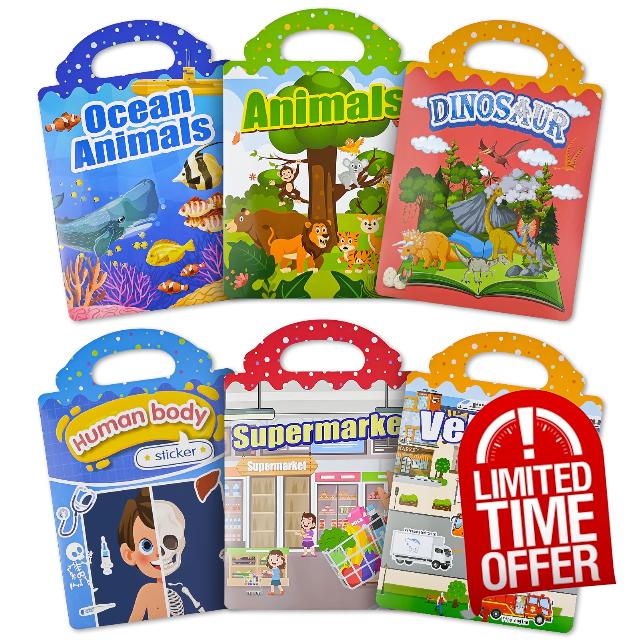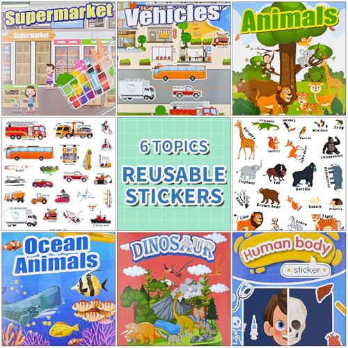 - 6 Packs Sticker Books Set:Contain vehicles, animals,dinosaur,ocean,body,supermarket. Suitable for kids to learning early vocabulary while playing!