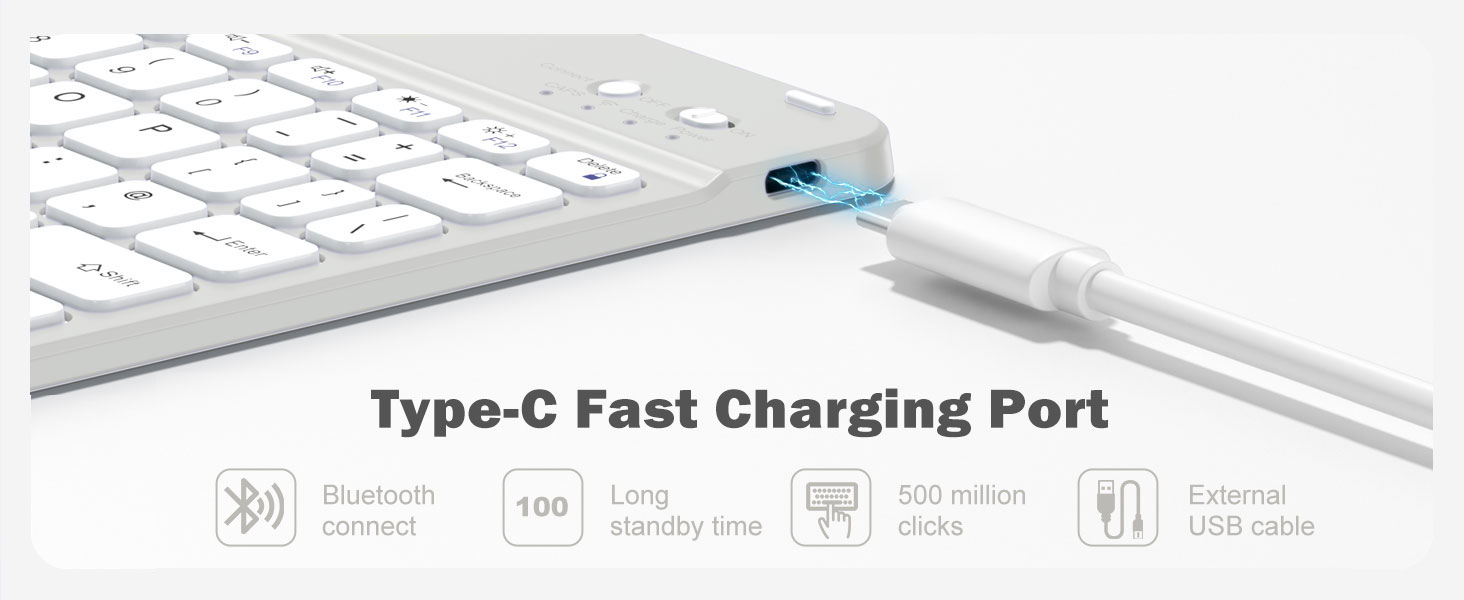- – – : The iPad Air 11 inch keyboard equipped with a built-in battery with large capacity. Coopertated with the low power consumption and energy saving mode, it can ensures a usage time of at least 100 hours. This iPad Air 10.9 inch keyboard can be fully charged in 2 hours with a Type-C charging cable, no battery replacement required.