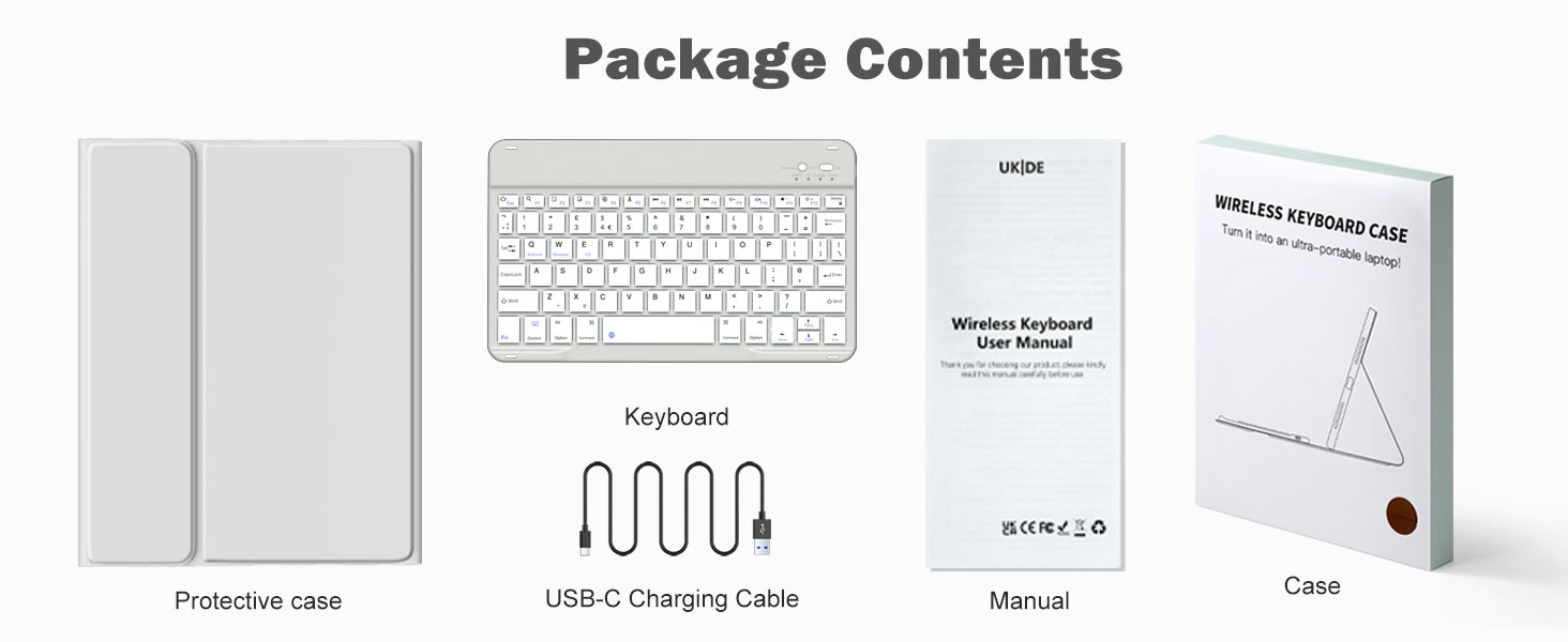 - & : The package includes: 1 x iPad Air case, 1 x Bluetooth iPad keyboard, 1x Type-C charging cable, 1 x user guide. If you have any questions regarding the compatibility or functionality of the keyboard case after receiving the product, please feel free to contact us. Our customer service team is dedicated to providing you with prompt and satisfactory assistance.