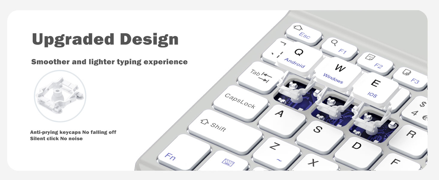 - – : The iPad Air keyboard features an upgraded Anti-fall & Anti-pry design that prevents keys from detaching due to drops, bumps, or accidental scratches. Additionally, the ergonomic and mechanical scissor keys offer you a fast, smooth, and precise typing experience. The scissor key's rebound mechanism also significantly reduces noise.