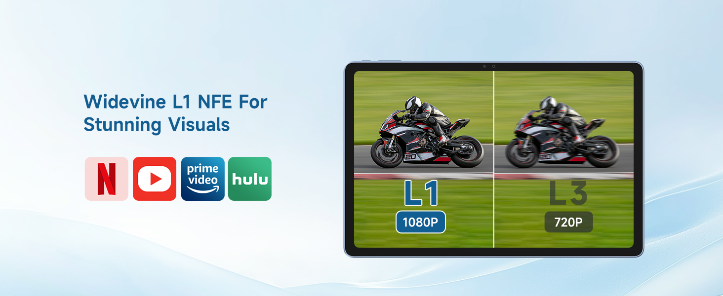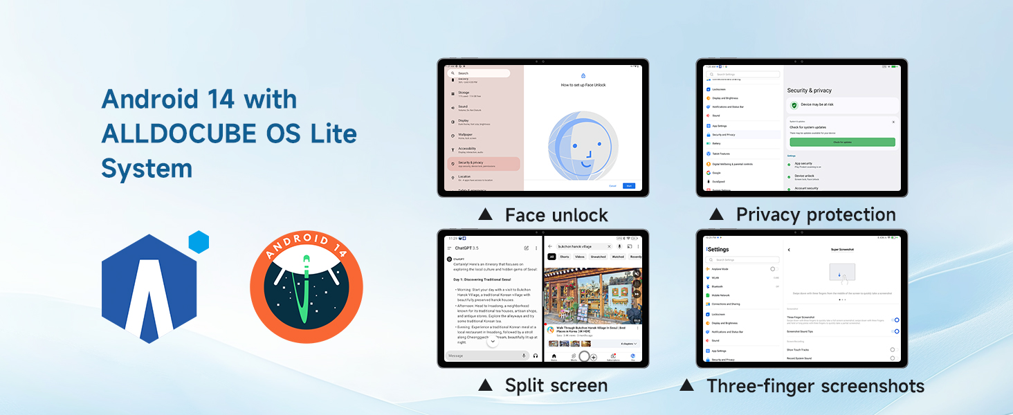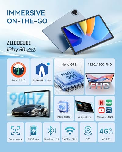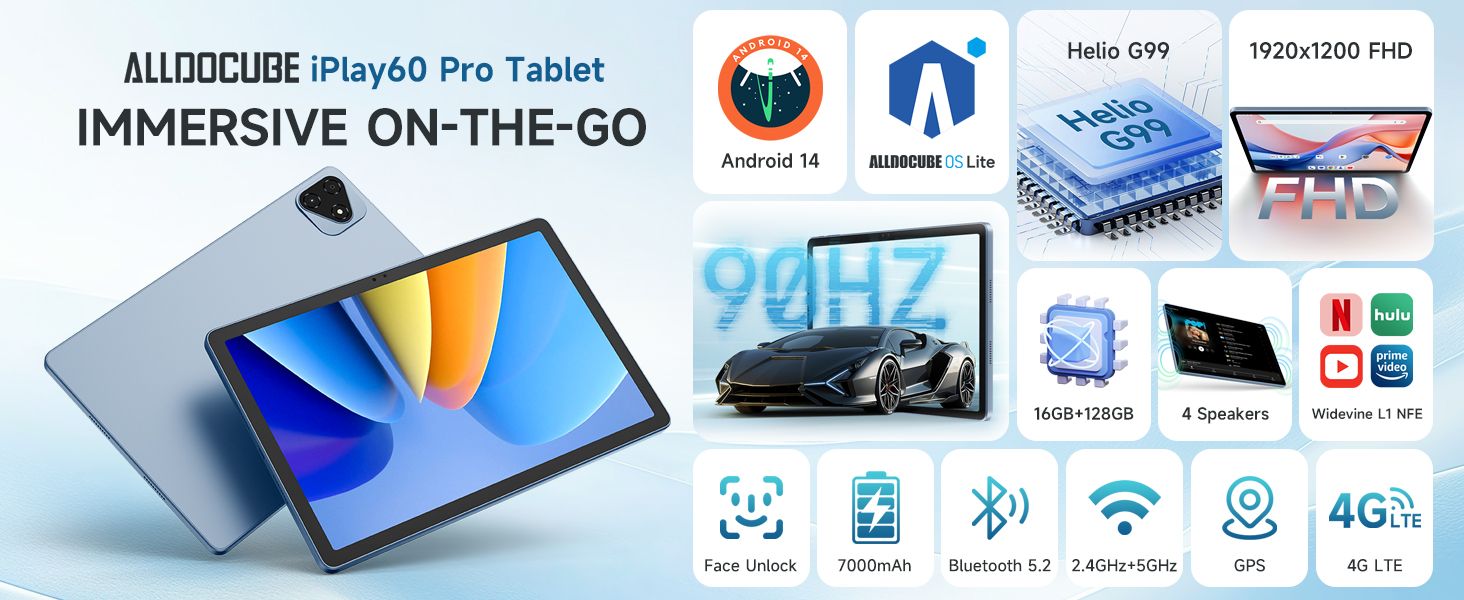 - [Alldocube OS Lite on Android 14] Alldocube iPlay60 Pro tablet is equipped with the latest Android 14 operating system, making the tablet smoother and more convenient to use. The Android tablet adds new features such as the docking bar and file transfer to Flash. With Widevine L1 certification, you can enjoy seamless streaming of high-definition content from platforms such as Netflix, YouTube, Hulu, Disney, etc.