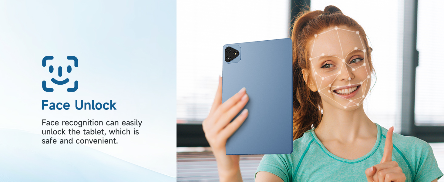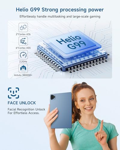- [High Performance Tablet with G99 CPU] ALDOCUBE 11 inch tablet, equipped with the Helio G99 CPU with the Antutu score of 400,000, offers high speed and responsiveness. By using 6nm technology to improve performance and battery efficiency, the tablet is ideal for multitasking and daily use. In addition, this Android tablet is equipped with facial recognition for unlocking, giving you a more user-friendly experience.