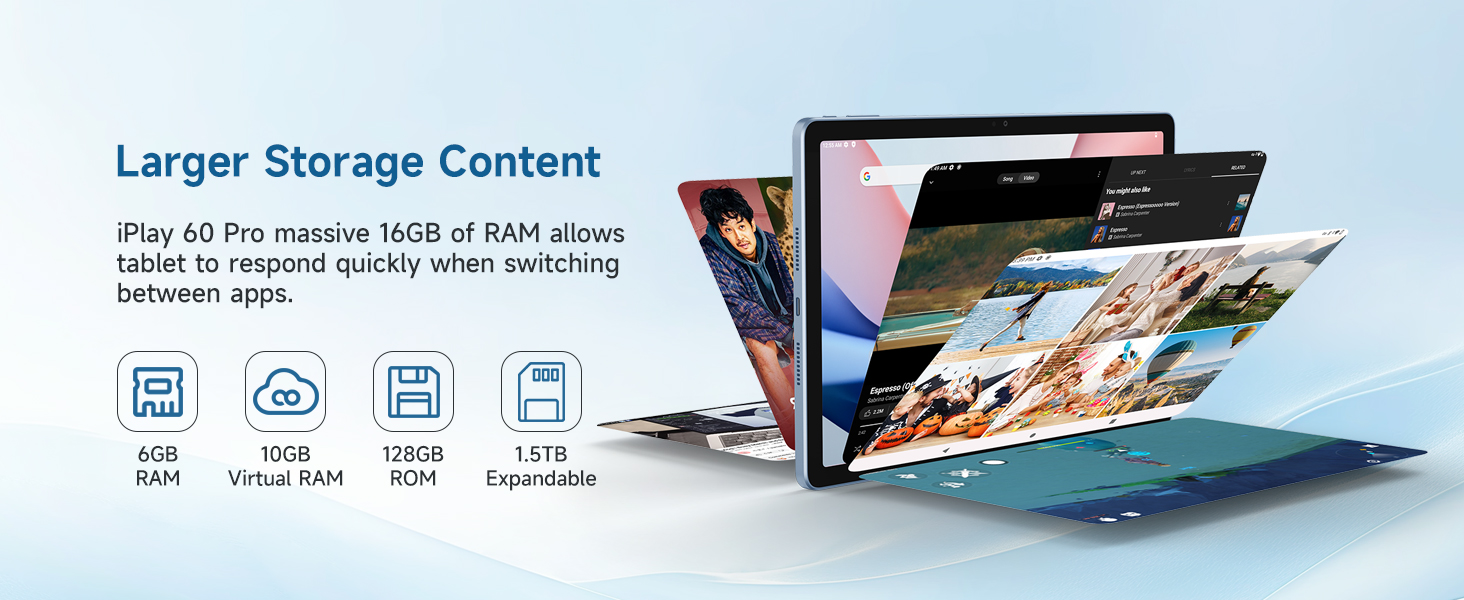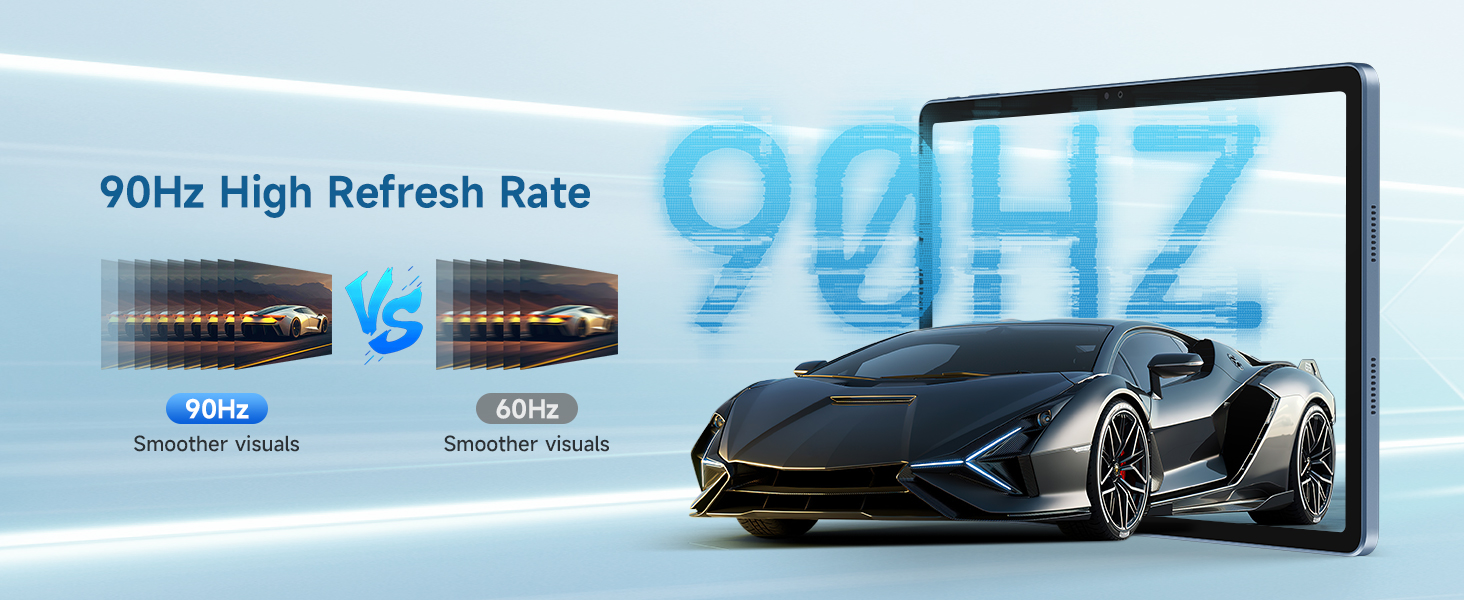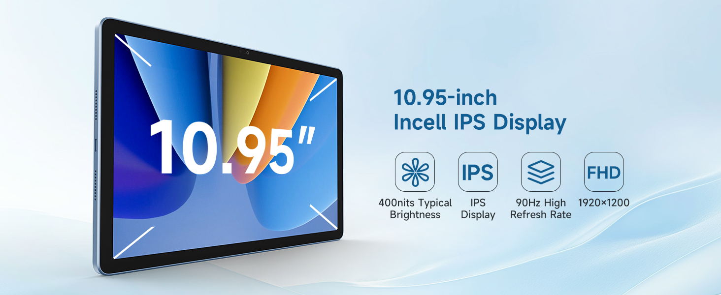 - [10.95 inch 90Hz Immersive Screen] iPlay 60 Pro Tablet has a large 11 inch IPS Incell screen with a resolution of 1920*1200, which offers vivid colours. With a refresh rate of 90Hz, the tablet improves the smoothness and clarity of the display compared to standard 60Hz screens. Also, this Android 14 tablet is equipped with an ambient light sensor that automatically adjusts the brightness of the screen to give you a more comfortable experience.