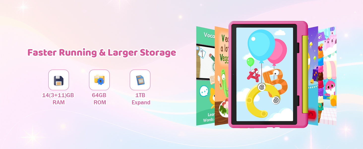 - 【14GB RAM+64GB ROM】 The kids tablet with 14(3+11)GB RAM and 64GB ROM and expandable up to 128GB(not include TF card). The toddler tablet is designed for kids and has pre-installed free kids apps with no ads. You can let kids learn English, numbers, drawing, and games.