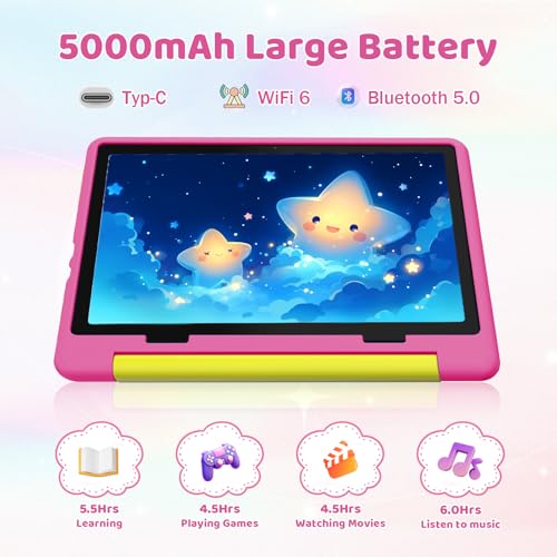 - 【Super Long Battery Life】The children's tablet builts 5000mAh Large Capacity Battery, allowing your children to study and play more easily without frequent charging. By enabling a dark theme and managing background activities, you also can extend battery life for extended usage.