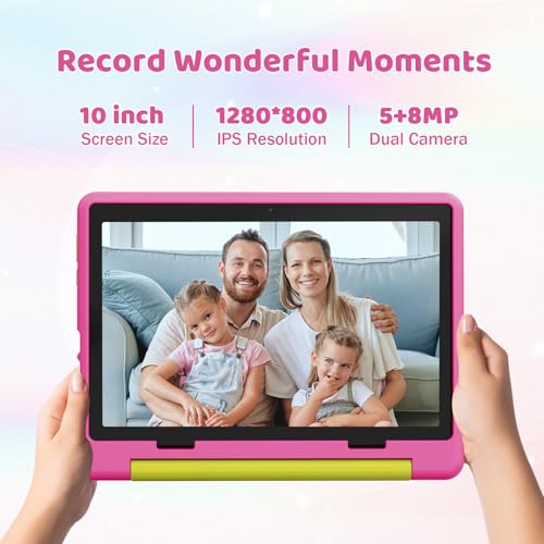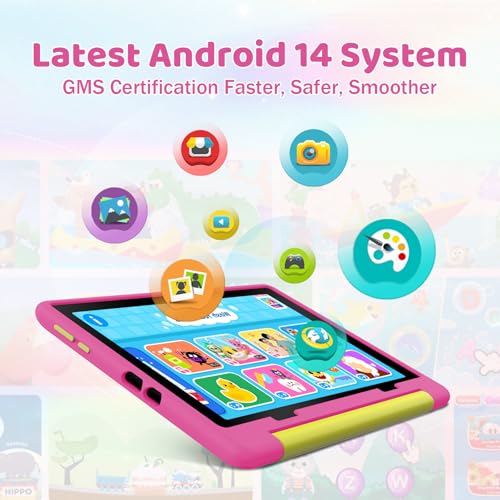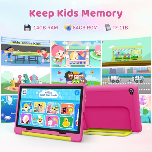 Kids tablet 10 inch Android 14 Tablets for Kids with 1280 * 800 IPS Display, 14GB RAM+64GB ROM, 5000mAh Battery, WiFi, Type-C, Kids Tablets with 8MP+5MP Dual Camera, Kid-Proof Case (Pink)