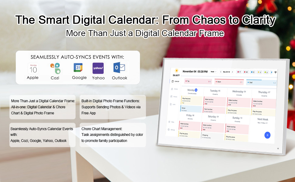 - All-In-One Digital Calendar: WiFi digital picture frame + planner touchscreen display + digital calendar that will get the whole family organized and running smoothly. It’s never been easier to keep the whole family informed by assigning each member their own color and chores.