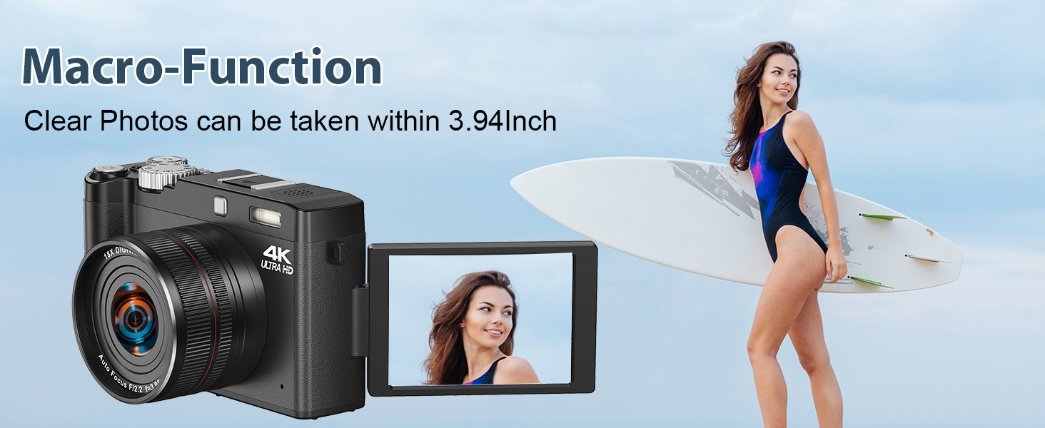 - 【Smart Autofocus & Macro Mode】Experience the benefit of hassle-free photography with intelligent autofocus and one-touch macro capabilities. The 4K Digital Camera for photography makes capturing delicate flowers on a hike or a child’s playful moments effortless, even as close as 10cm(3.94Inch). Its simplicity guarantees clear, professional results every time.