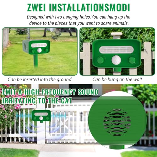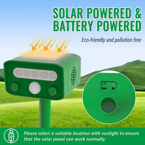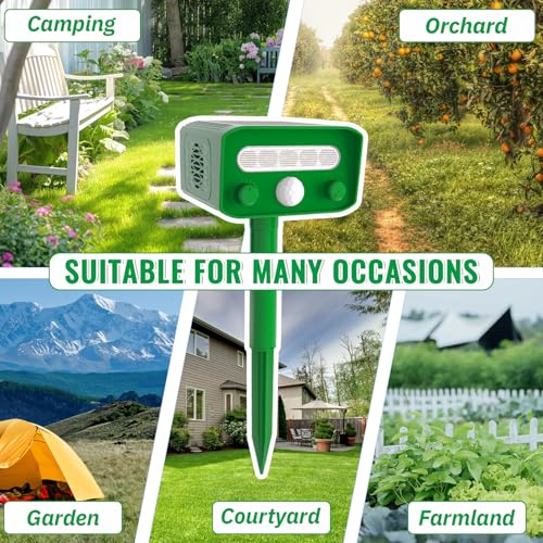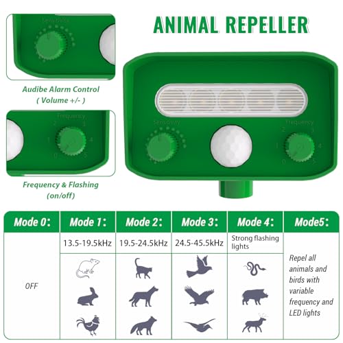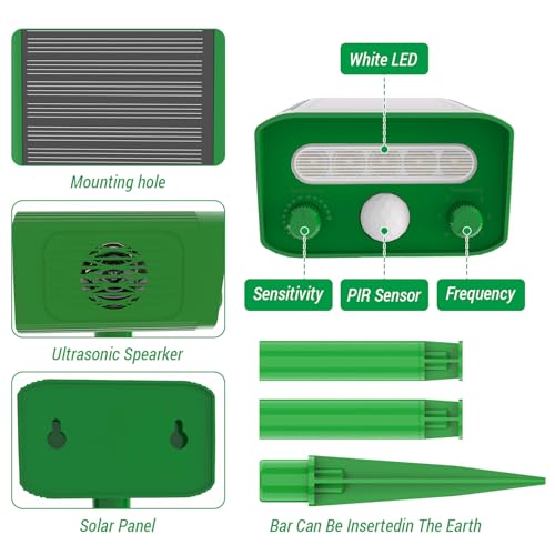 - 【Motion Sensor Technology】: Animal repeller features PIR sensors that activates ultrasonic waves the moment animal approaches, instantly deterring animal. The infrared PIR sensors ensure quick response, releasing targeted ultrasonic waves that repel deer cat dog raccoon squirrel skunk rabbit and more, effectively keeping your space pest-free
