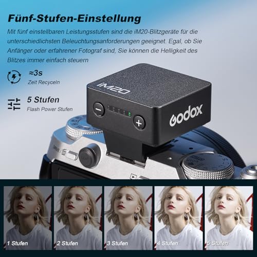 - The GODOX iM20 flash is designed for ultimate portability. Compact and travel-friendly, they fit seamlessly in your pocket while attached to your camera. The hassle-free design means you never have to take them off. Equipped with a built-in rechargeable lithium battery and Type-C charging, you can recharge at any time and continue shooting without interruption. With five adjustable power levels, these flash units adapt perfectly to any lighting condition. The single-contact design also ensures compatibility with a wide range of cameras, from DSLRs to mirrorless cameras and entry-level models.