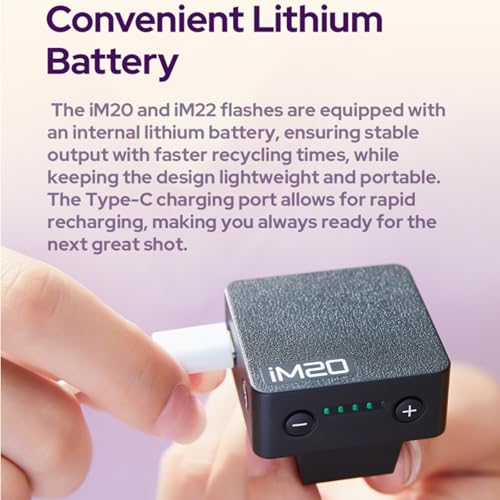 - [Convenient Lithium Battery] The iM20 flash is equipped with an internal lithium battery, ensuring stable output with faster recycling times, while keeping the design lightweight and portable. The Type-C charging port allows for rapid recharging, making you always ready for the next great shot.