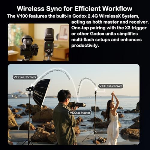 - Wireless Sync for Efficient Workflow: The V100 features the built-in Godox 2.4G WirelessX System, acting as both master and receiver. One-tap pairing with the GODOX X3 trigger or other Godox units simplifies multi-flash setups and enhances productivity.
