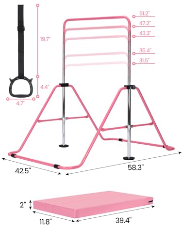 M.J COMFY-LIFE Kids Gymnastics Bar with Mat – Adjustable Easy Assembly Training Kip Bar Horizontal Bar for Home, Gymnastics Equipment for Kid 5-12 years