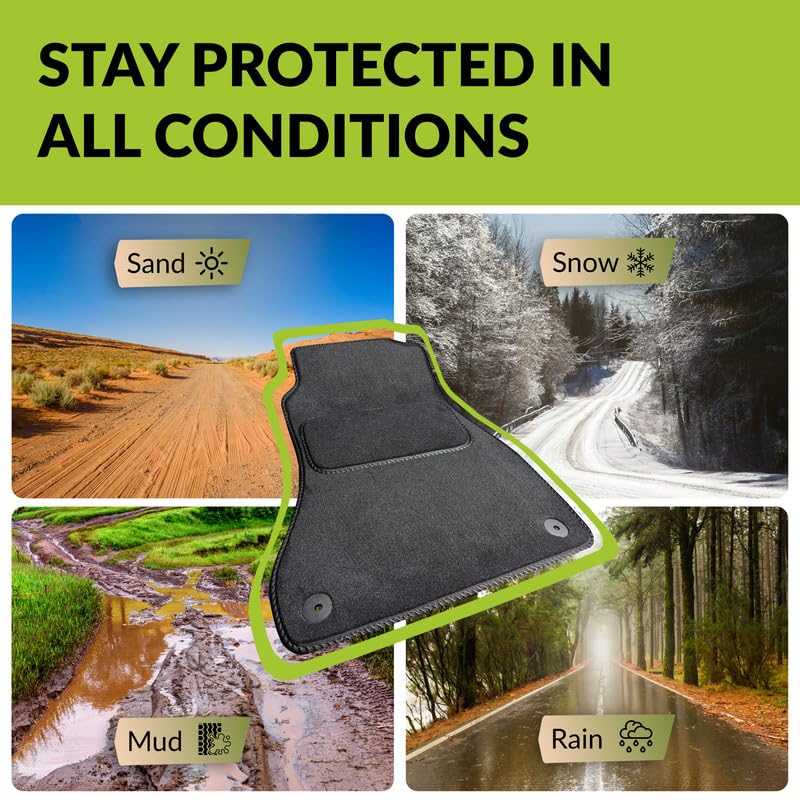 - ALL-WEATHER PROTECTION – Keep your car foot mats safe from dirt, mud, spills, and water. These mats are made for every weather, these mats are waterproof and tough, keeping your car’s interior safe from everyday use.