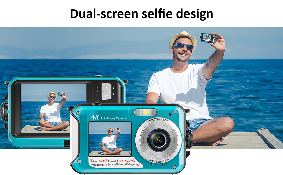 - Dual screen design: this underwater camera has a rear-facing 2.8 inch LCD colour display and a second forward-facing 1.7 inch selfie screen. With the built-in 2/5/10 second self-timer that allows you to deal with all the boys, you won't miss a moment of action at family celebrations. With the flashlight, you can also take vivid pictures in dark or dark environment.