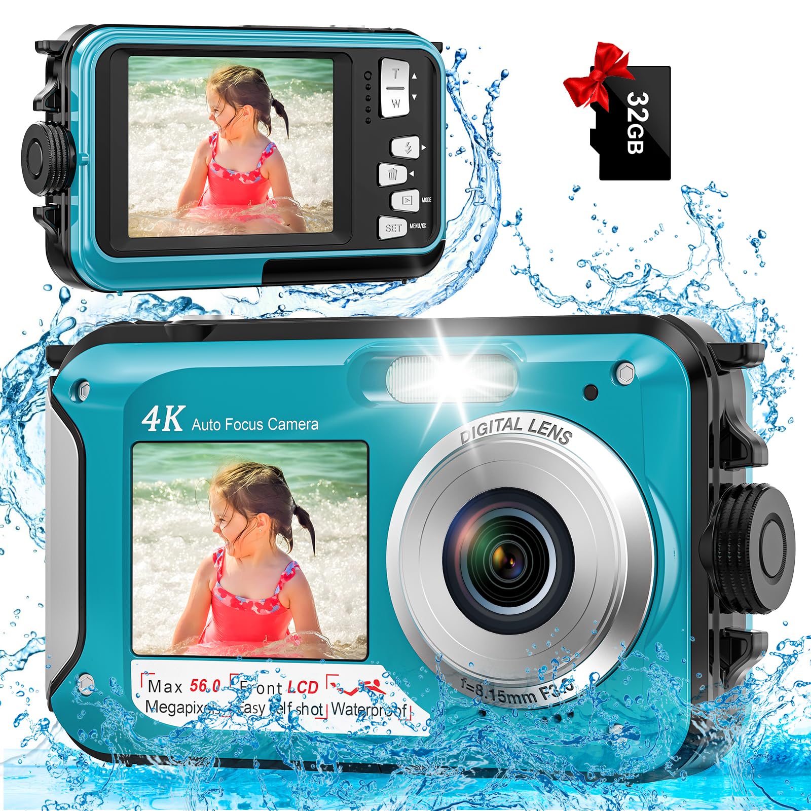 Yixinxin Underwater Digital Camera 4K 11FT Waterproof with 32GB Card 56MP Autofocus Dual-Screen Selfie for Snorkeling