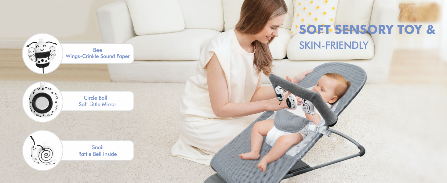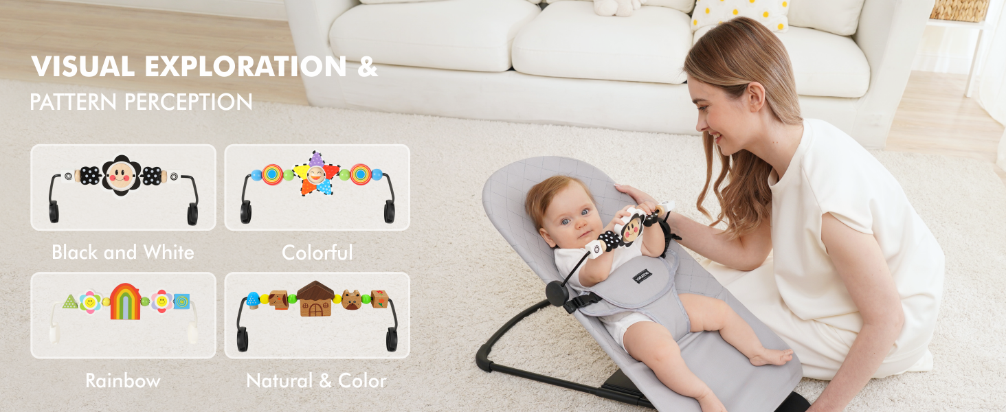 - Multisensory Development: Play bar for bouncer brings infinite fun to baby, enhances baby's concentration, improves the ability to perceive colors, senses, shapes and stimulates the brain's development and growth.Our toys for bouncer entertainment are completely safe, making them Our toys for bouncer entertainment are completely safe, making them suitable for teething babies and chewers.Once secured, it keeps your child entertained while you attend to household chores or relax