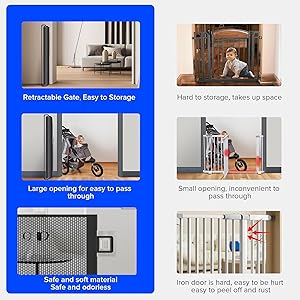 - Retractable Convenience: Achieve a perfect fit with adjustable gate sizes and a retractable mesh cover, reducing trip hazards while maximizing space efficiency for your baby gate needs
